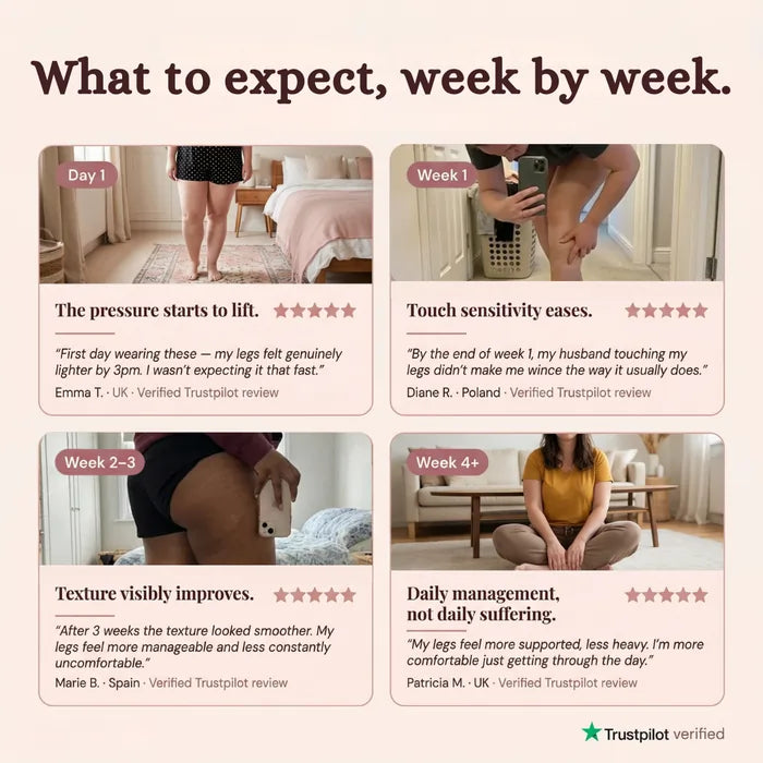 This gentle, graduated pressure improves blood and lymph flow by up to 30%, helping to reduce swelling, pain, and fluid buildup — the main causes of lipoedema discomfort.